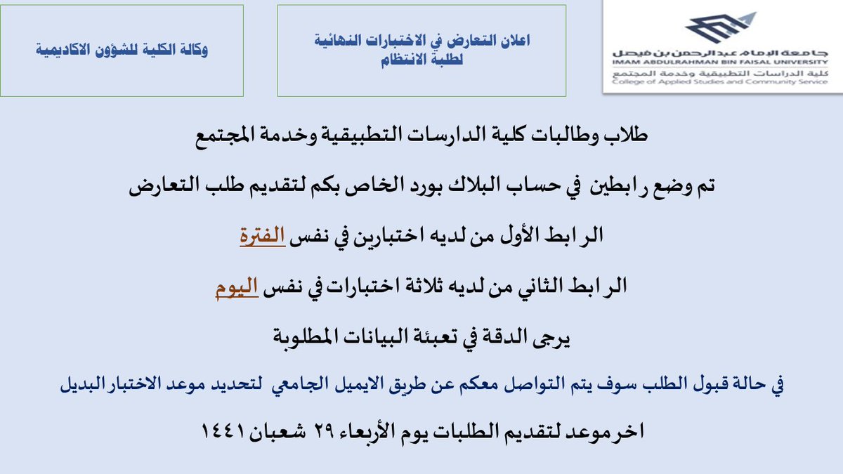 كلية الدراسات التطبيقية وخدمة المجتمع On Twitter إعلان هام لمن لديه تعارض في جدول الاختبارات النهائية للفصل الدراسي الثاني العام الجامعي ١٤٤١هـ كلية الدراسات التطبيقية وخدمة المجتمع جامعة الإمام عبدالرحمن بن فيصل Https T Co 4nm0fcsdcb